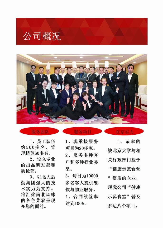 公司现有员工600余人,服务单位110家,厨房80余个。每日为上万名宾客提供餐饮、物业和配餐服务。项目分布在北京市区、平谷、房山、大兴、天津等地区。