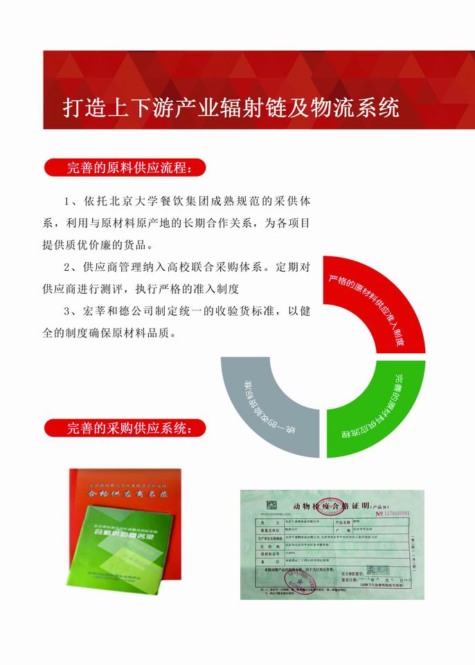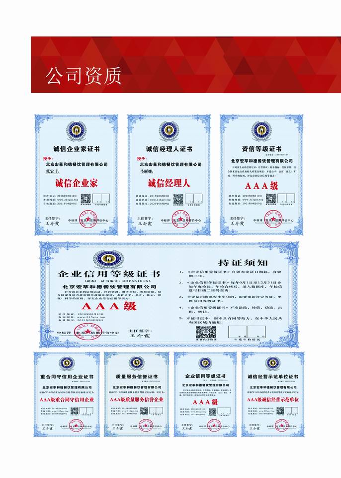 经过多年不断地探索与创新,公司形成了一套成熟的管理体系。公司现已通过《食品安全管理体系认证》、《质量管理体系认证》、《环境管理体系认证》、《职业健康安全管理体系认证》和《AAA级企业信用等级认证》,实现了“用服务创造价值,用信誉赢得口碑,用特色彰显自我,用品牌抢占市场”的目标,成为了甲方“信得过、靠得住、能放心”的餐饮、物业、配餐管理公司。