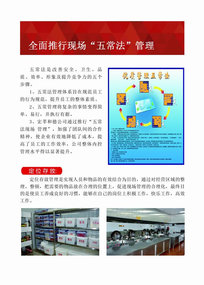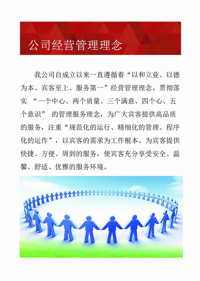 公司自成立以来,一直遵循“以和立业、以德为本、宾客至上、服务为首”的经营理念,秉承“标准化、规范化、程序化、制度化、信息化、产业化”的管理思想,严格落实“一个中心、两个质量、三个满意、四个心、五个意识”的服务理念,以专业的管理团队、新鲜的食材、健康的营养搭配、丰富的精美菜肴,时刻为广大宾客提供高品质的服务。