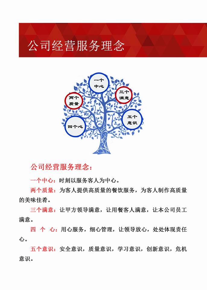 公司自成立以来,一直遵循“以和立业、以德为本、宾客至上、服务为首”的经营理念,秉承“标准化、规范化、程序化、制度化、信息化、产业化”的管理思想,严格落实“一个中心、两个质量、三个满意、四个心、五个意识”的服务理念,以专业的管理团队、新鲜的食材、健康的营养搭配、丰富的精美菜肴,时刻为广大宾客提供高品质的服务。