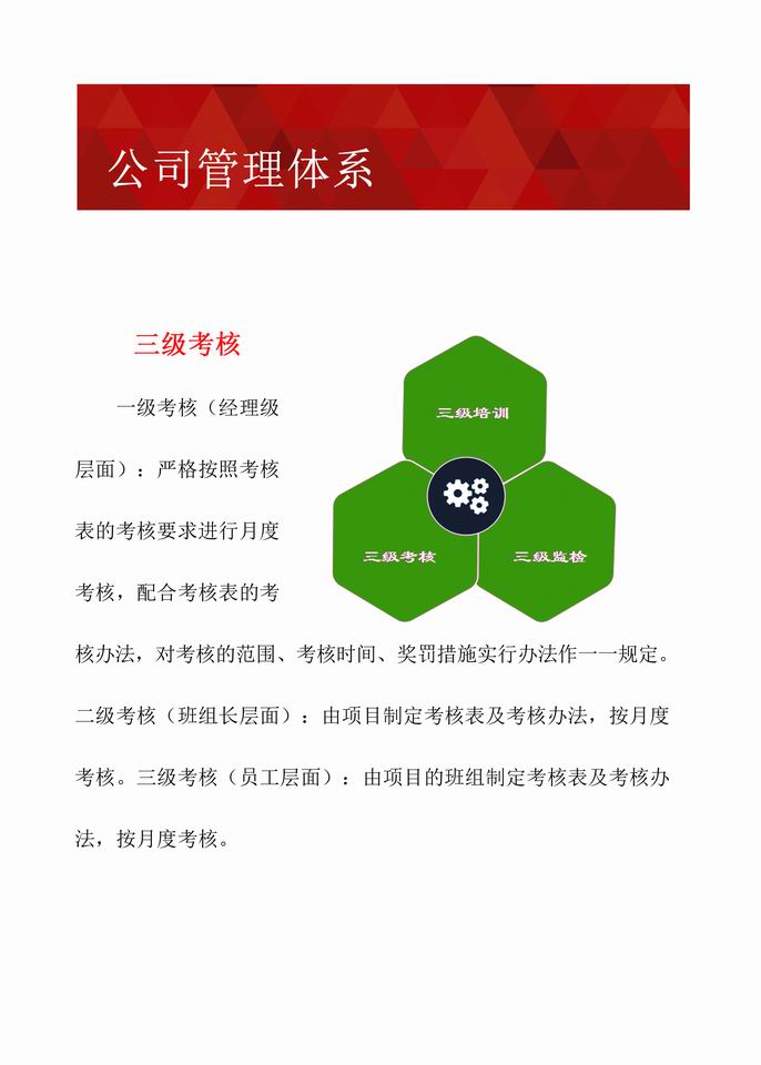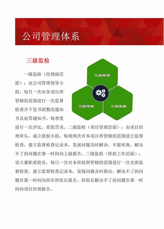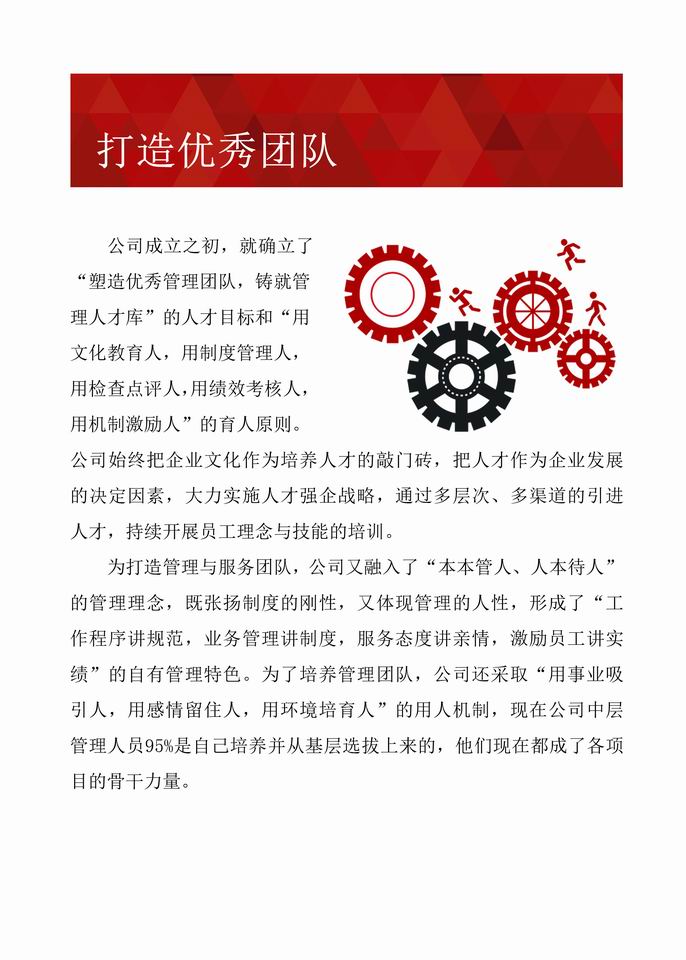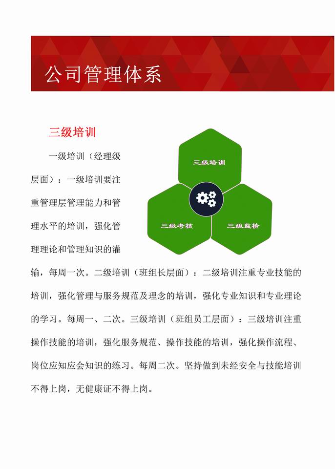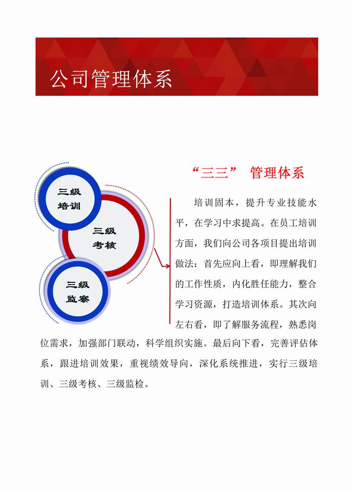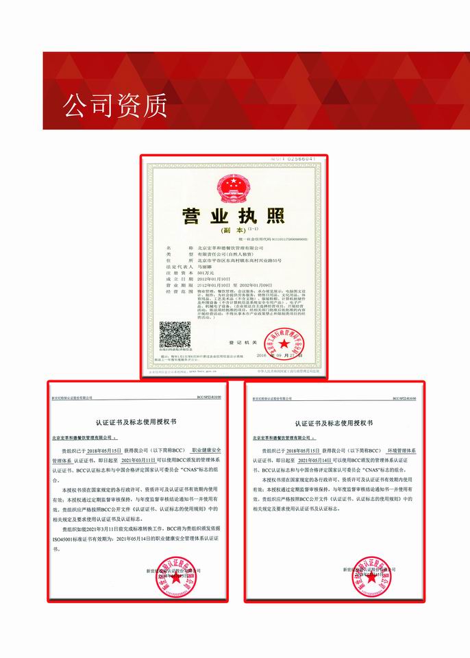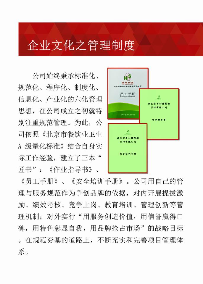 经过多年不断地探索与创新,公司形成了一套成熟的管理体系。公司现已通过《食品安全管理体系认证》、《质量管理体系认证》、《环境管理体系认证》、《职业健康安全管理体系认证》和《AAA级企业信用等级认证》,实现了“用服务创造价值,用信誉赢得口碑,用特色彰显自我,用品牌抢占市场”的目标,成为了甲方“信得过、靠得住、能放心”的餐饮、物业、配餐管理公司。